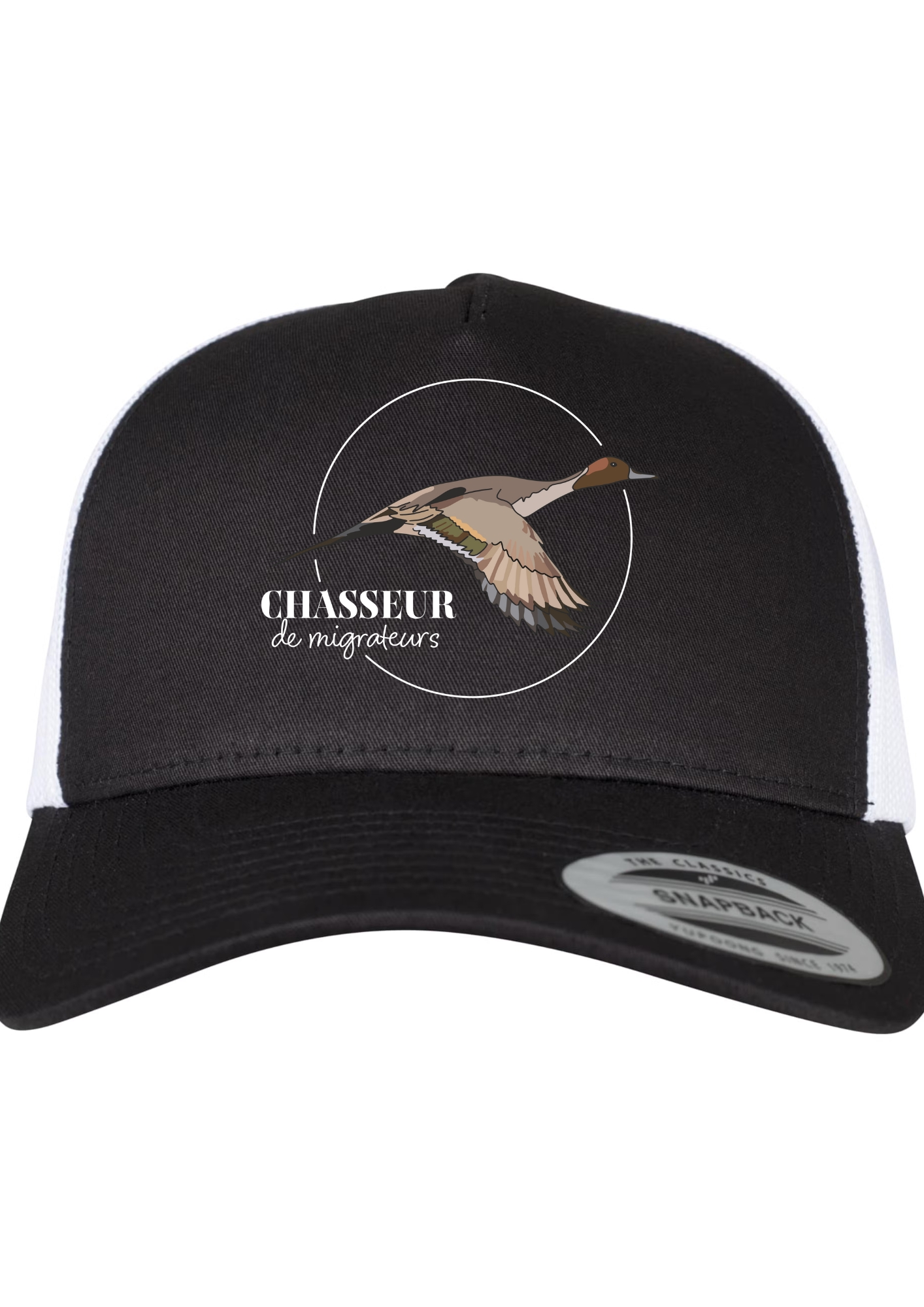 65% polyester / 35% coton. Casquette trucker 5 panneaux à fermeture snapback. Surpiqûres à 8 rangs sur la visière.